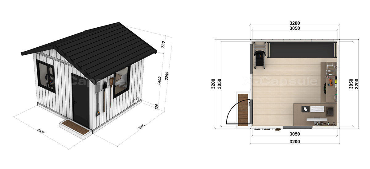 10㎡ Basic Module is suitable for one person. It can be used as functional spaces such as courtyard guest rooms, tool rooms, and storage rooms, and its purpose can be quickly adjusted according to needs.